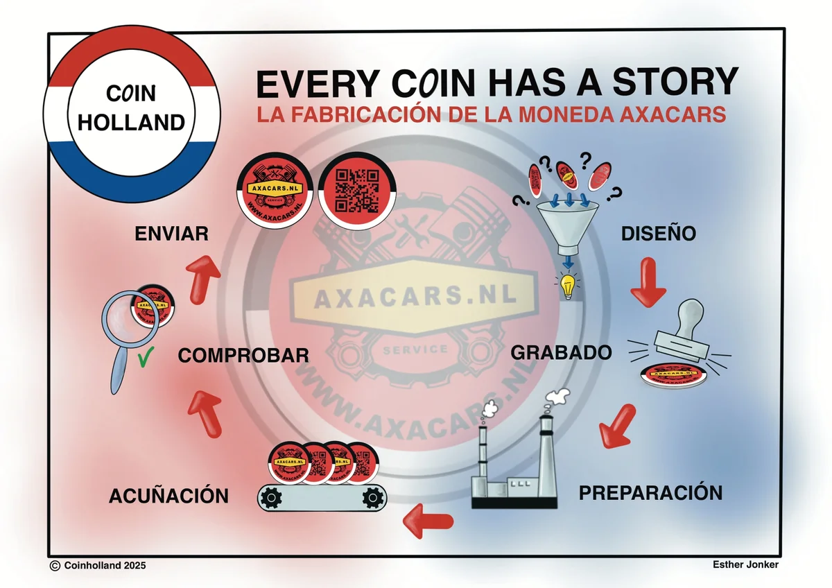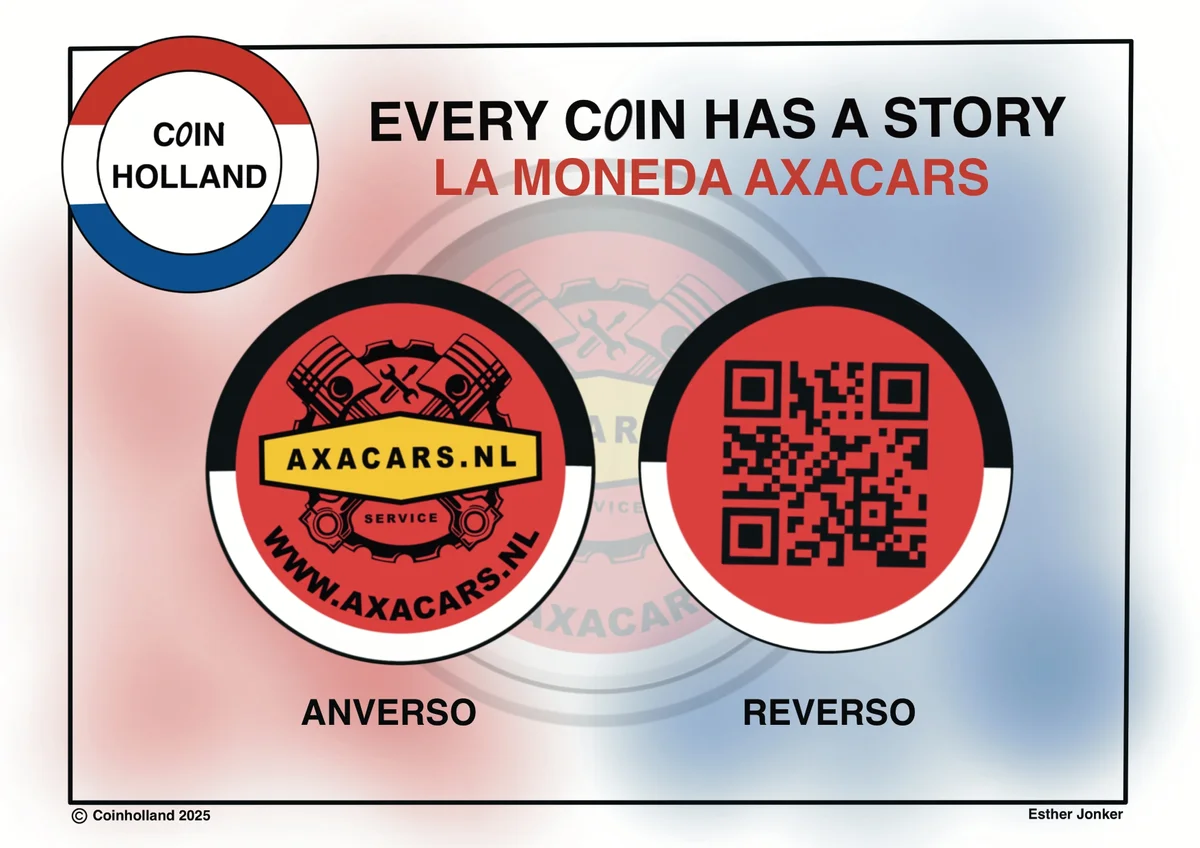 Axacars se puso en contacto con Coinholland para crear un diseño distintivo que representara los servicios que ofrece, transformándolo en una moneda de negocios que también incluyera un enlace a su página web.